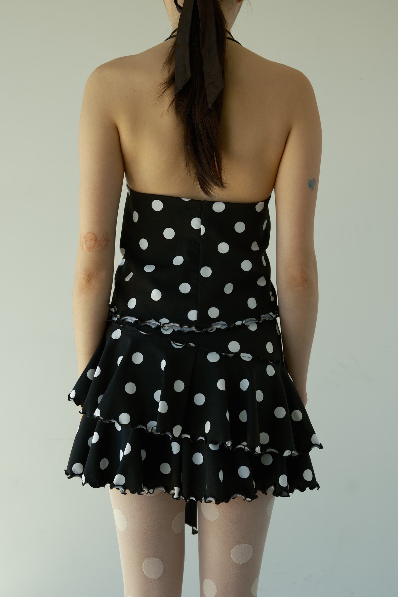 Pullover halter top with a cutout twist front and adjustable tie closure at the back neck. Made from deadstock spandex, this style is fully lined and finished with a delicate lettuce edge. Wash cold with like colors; line dry.