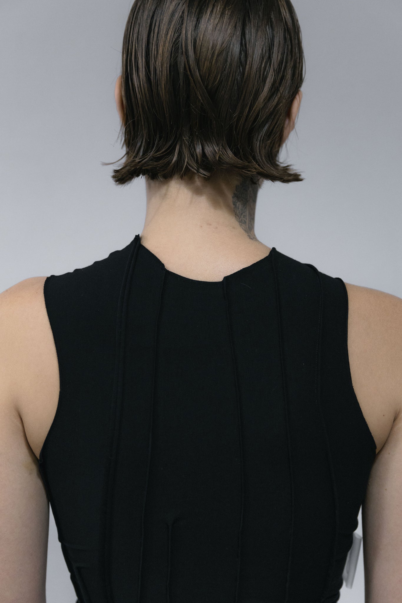 Black sleeveless long dress. Asymmetric form of clothes, raw material finishes, stitching on the material, unique form. Handmade from high-quality elastic organic cotton in Cracow. Finished garments may vary due to artisanal manufacturing. Designed and sewn in Poland.